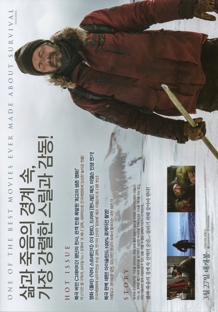 광활한 눈밭을 주인공 매즈 미켈슨이 생존을 위해 돌아다니는 모습