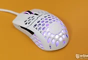 오른손잡이 비대칭으로 마우스 무게의 경량화를 위해 하우징의 바닥 면과 윗부분에 벌집 모양의 타공처리된 디자인으로