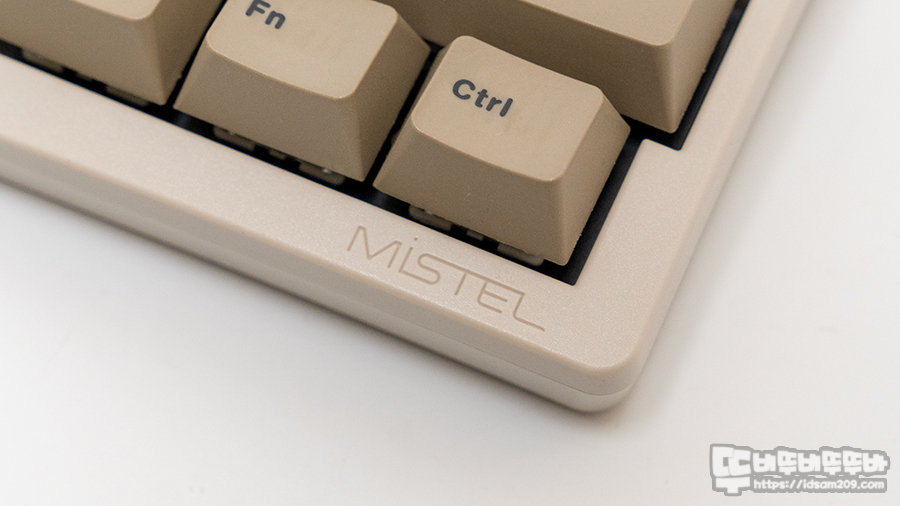 키보드 상단에는 M(매크로), A(Caps Lock), B(블루투스/페어링/충전) 작동 시 표현하는 LED 인디케이터 그리고 오른쪽 하단에는 제품의 아이덴티티인 Mistel 로고를 확인할 수 있고요.