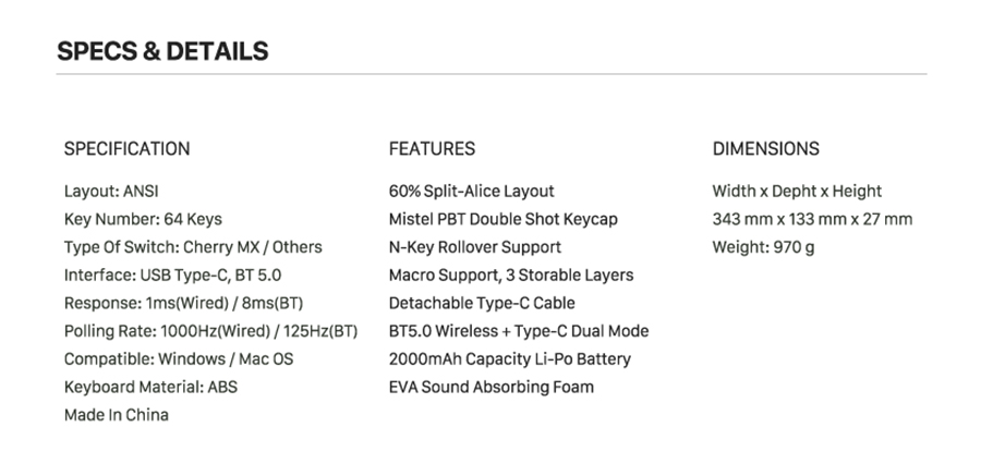 ANSI 60% 스프릿 앨리스 배열 / 64 키 구성 / 핫스와프 기판 적용 / 유선 또는 무선 사용 가능 / 멀티 페어링 3대 연결 / PBT 이중사출 키캡 / 2000mAh 배터리 내장 / EVA 흡음재 사용 / 등의 정보를 확인할 수 있는데요.