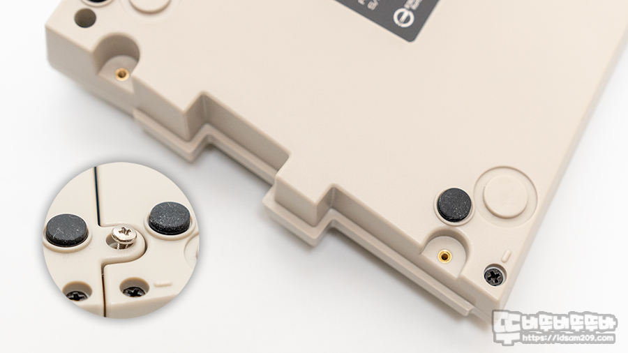 키보드 하판에는 기본적으로 ● 보이는 미끄럼 방지 패드 그리고 ◎로 음각으로 표현되는 부분은 자석이 내장되어 높이 조절이 범폰은 탈착형으로 장착할 수 있는 구조로 디자인되었습니다.