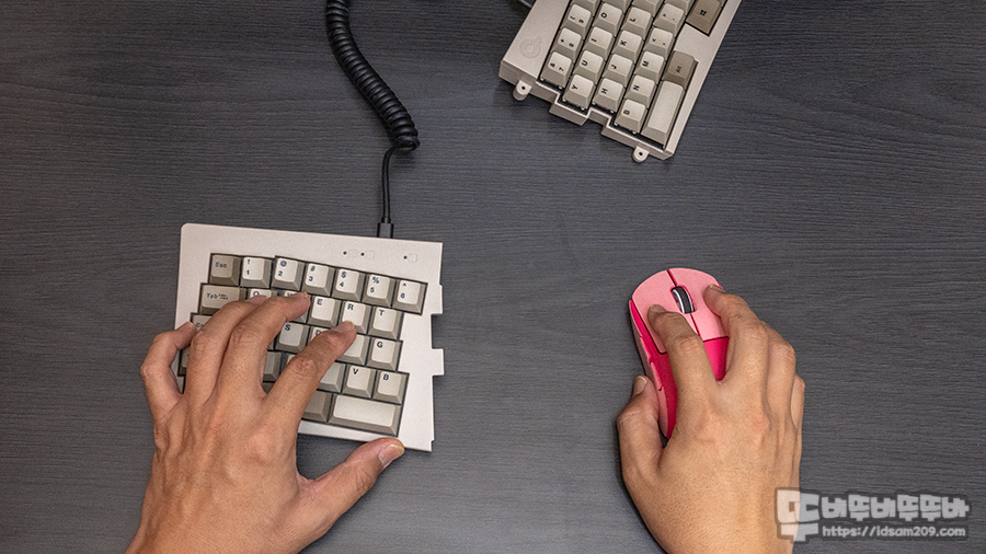 손가락이 부채처럼 펼쳐지는 앨리스 배열이지만 스플릿 키보드의 가장 큰 강점이라면 좌/우 배열을 조절하여 사용할 수 있다는 점인데요.