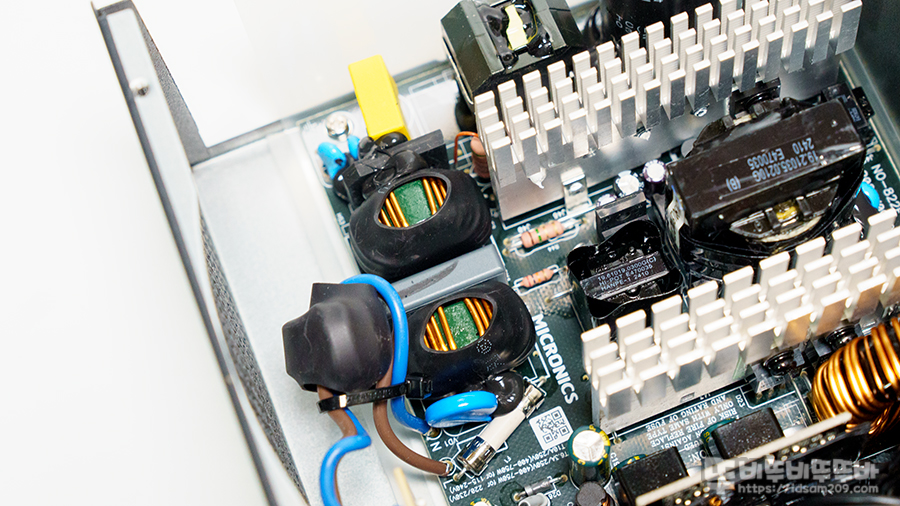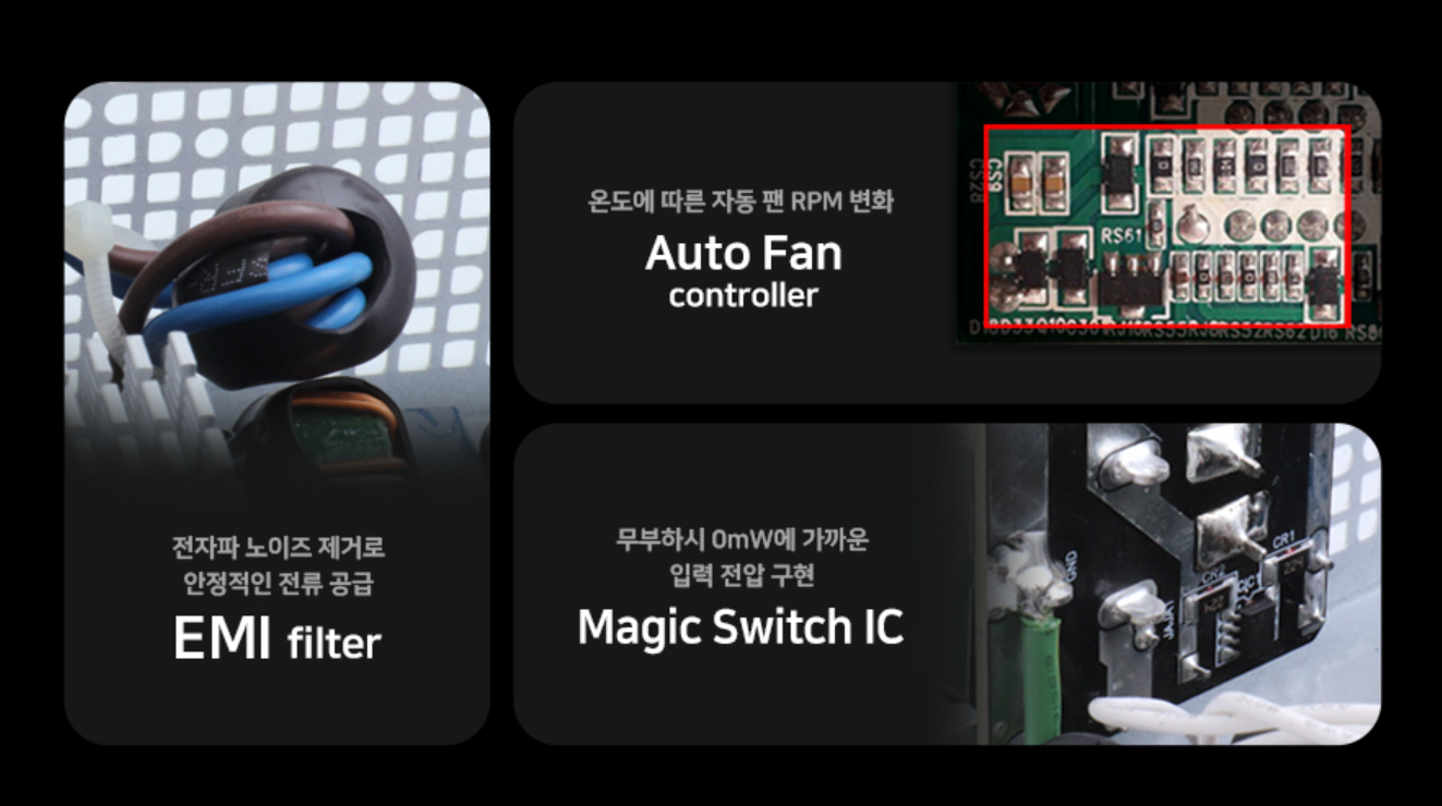 대만 TEAPO사 105℃ 온도를 견디는 420V/470㎌ 캐패시터와 고급스러운 디자인의 코일이 사용된 역률 99% 효율 담당하는 액티브 PFC 회로, 온도에 따라 팬 RPM 변화를 주는 오토 팬 컨트롤러 그리고 AC 소켓 부분에 부착된 무부하 시 0mW에 가까운 입력 전압을 구현하는 매직 스위치 회로와 소켓 부분과 기판 부분에 2중으로 설계된 전자파 노이즈를 제거하는 EMI 필터 구현과 DC to DC 회로 적용으로 안정적인 +3.3V, +5V, +12V 전압 출력을 지원을 확인할 수 있습니다.