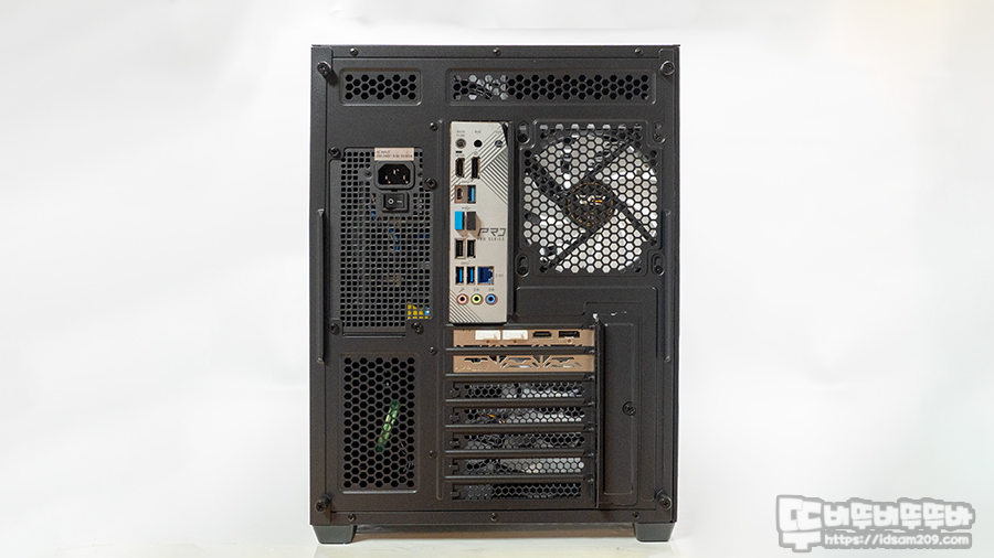 파워 서플라이 뒤면에는 전원 스위치와 AC 코드 소켓 그리고 공기 유입이 용의 하게 타공 된 샤시면을 확인할 수 있습니다.