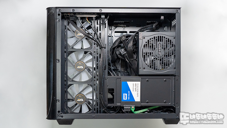 시스템 조립에 사용된 다크플래시 DPW90 ARGB CURVED 강화유리 케이스는 파워 서플라이 장착 부분이 샤시 중앙에 위치하여 여러모로 편리한 조립이 가능했습니다.