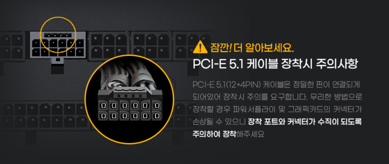 중급 이상의 4000번대 모델을 사용하게 된다면 PCIe 5.1 커넥터를 이용하여 간편하게 사용할 수 있을 거 같습니다.