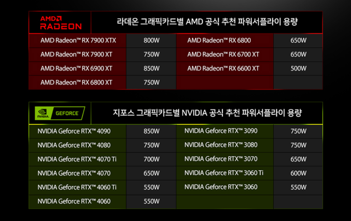 예전에 공유되었던 추상적인 그래픽카드에 필요한 최소 파워 서플라이 용량을 제시했다면 요즘은 파워 서플라이 업체에서 권장 용량을 제시해 주기에 시스템 조립 시 사용되는 부품에 비례하여 파워서플라이를 선택하는데 도움을 줍니다.