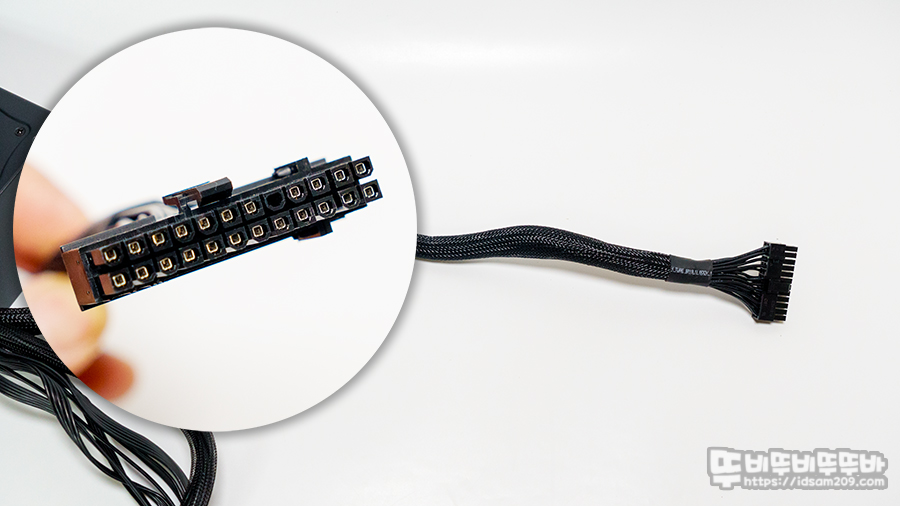 메인보드에 연결되는 20+4 커넥터는 550(±20) mm 길이로 케이블은 슬리빙 처리가 되어 시스템 조립 시 케이블이 분산되는 것을 방지해 주고 있습니다.