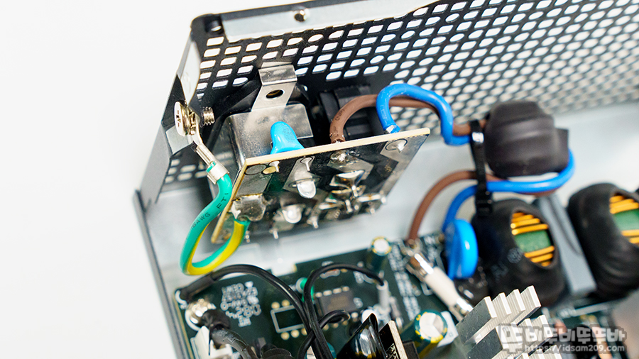 대만 TEAPO사 105℃ 온도를 견디는 420V/470㎌ 캐패시터와 고급스러운 디자인의 코일이 사용된 역률 99% 효율 담당하는 액티브 PFC 회로, 온도에 따라 팬 RPM 변화를 주는 오토 팬 컨트롤러 그리고 AC 소켓 부분에 부착된 무부하 시 0mW에 가까운 입력 전압을 구현하는 매직 스위치 회로와 소켓 부분과 기판 부분에 2중으로 설계된 전자파 노이즈를 제거하는 EMI 필터 구현과 DC to DC 회로 적용으로 안정적인 +3.3V, +5V, +12V 전압 출력을 지원을 확인할 수 있습니다.
