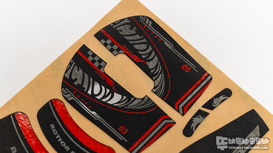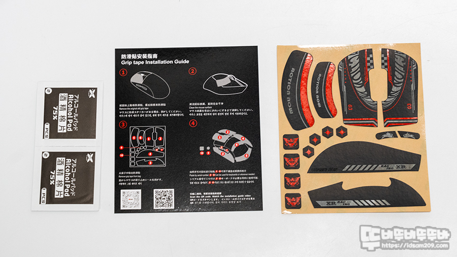 제품은 마우스 표면 클리닝을 위한 75% 알코올 패드, 부착 설명서, 그리고 그립 테이프로 구성되어 있습니다.