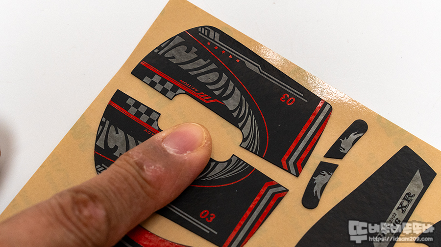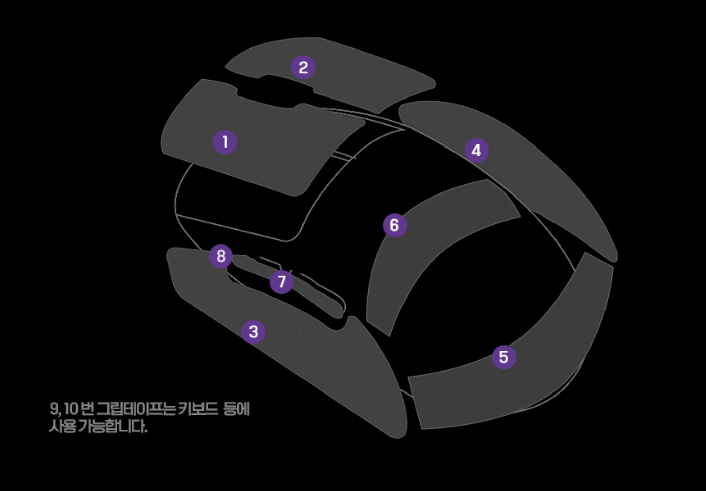 부착 가이드의 내용대로 부착하는 방법과 가이드에 포함되지 않은 네모, 육각형 테이프를 활용하여 사용자의 그립에 맞게 활용하시기 바랍니다.