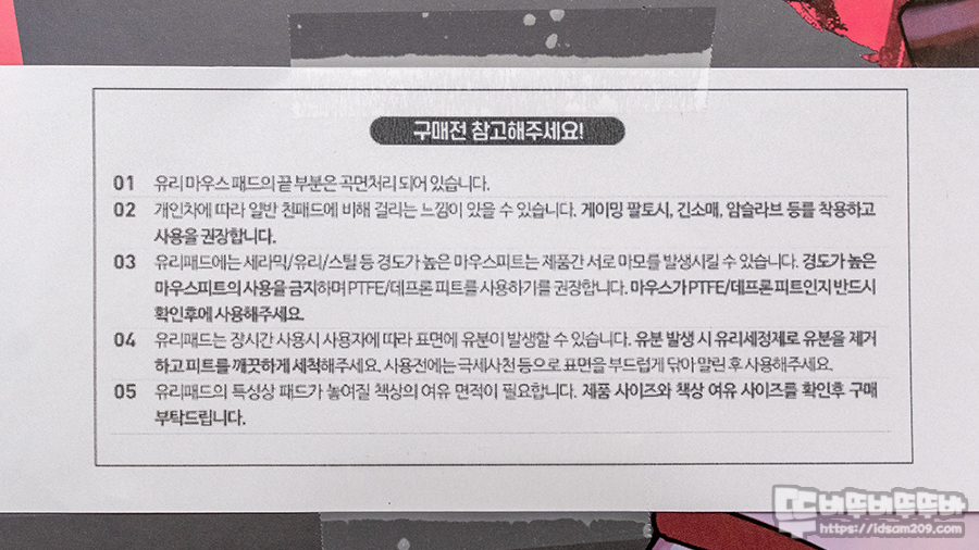 3. 유리 패드이기에 마우스에 강화유리 피트 사용 금지 등을 꼽을 수 있을 거 같네요.