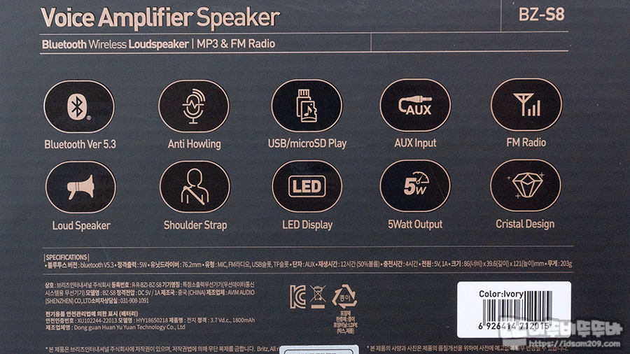 패키지 뒷면에는 제품의 포인트 특징인 블루투스 버전 5.3, 안티 하울링, USB/MicroSD 플레이, AUX 입력, FM 라디오, 확성기, 어깨끈, LED 디스플레이, 5W 출력, 크리스털 디자인 등이 강조되어 있고요.
