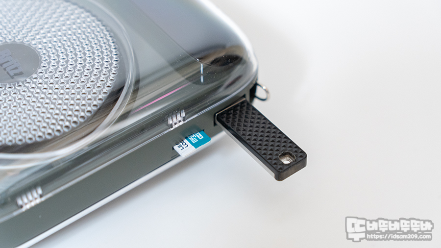 제품의 상단에는 멀티 펑션 버튼 M, 재생/일시 정지, 트랙 이동 버튼 그리고 AUX 외부 입력, MIC 입력 단자로 구성되어 있으며 왼쪽 측면에는 USB 메모리 & MicroSD(TF) 슬롯 그리고 오른쪽 측면에는 전원 On/Off 겸 볼륨 조절 노브, USB-C 충전 단자를 확인할 수 있습니다.