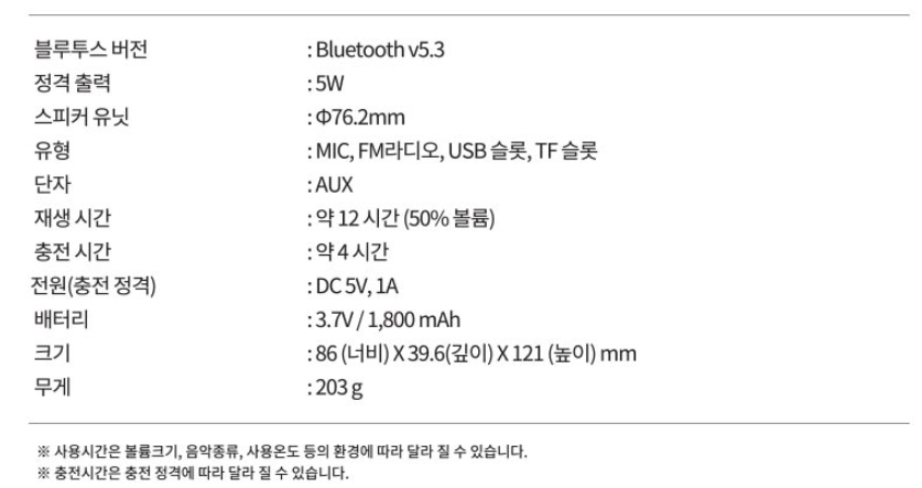 블루투스 버전 5.3, 스피커 유닛 76.2mm, 출력 5W, 배터리 1,800mAh, 충전 약 4시간, 재생 약 12시간 (볼륨 50%), 입력 모드 : 마이크, FM 라디오, USB 메모리, TF(MicroSD) 메모리, AUX 입력 등의 정보를 확인할 수 있습니다.