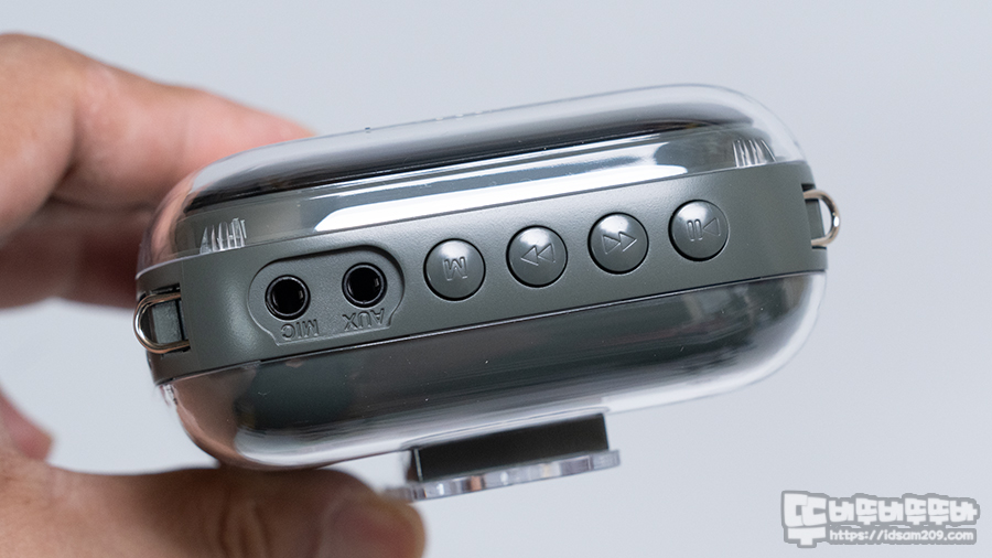 제품의 상단에는 멀티 펑션 버튼 M, 재생/일시 정지, 트랙 이동 버튼 그리고 AUX 외부 입력, MIC 입력 단자로 구성되어 있으며 왼쪽 측면에는 USB 메모리 & MicroSD(TF) 슬롯 그리고 오른쪽 측면에는 전원 On/Off 겸 볼륨 조절 노브, USB-C 충전 단자를 확인할 수 있습니다.
