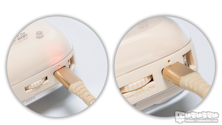 충전 중에는 LED 인디케이터가 레드 컬러 점등으로 표현되며 완충 시 LED Off로 표현됩니다.