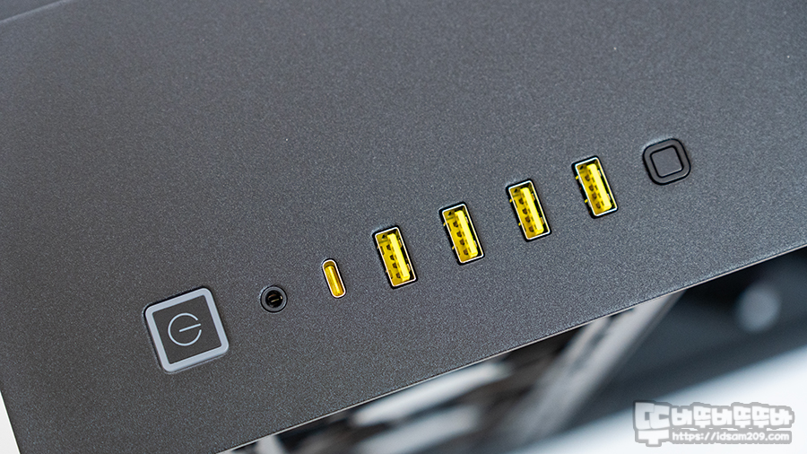 케이스 상단의 측면에 위치한 I/O 패널은 화이트 LED가 점등되는 전원 버튼, 4극 단자가 사용된 오디오/마이크 소켓, USB-C, USB-A 단자 그리고 리셋 버튼으로 구성되어 있고요.