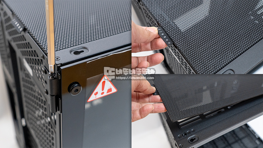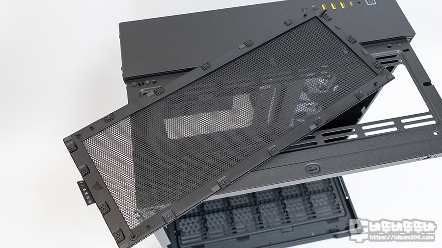 상단에 탈부착이 가능한 메쉬 필터는 앞쪽에 걸어주는 돌기가 있고 그 외에는 볼 헤드 타입의 돌기가 있어서 앞쪽에 돌기로 위치를 잡아주고 볼 헤드를 이용하여 샤시의 내부의 소켓에 딸깍하고 고정하게 됩니다.