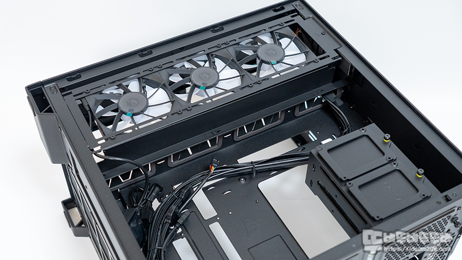 메인보드가 장착되는 샤시면과 사이드 면에 쿨러가 장착되는 면의 단차를 주어 샤시 뒤쪽의 케이블이 전면으로 나오는 형태로 디자인되어 시스템 조립 시 파워 서플라이 또는 각종 케이블류가 샤시면을 관통하는 모습을 보여주지 않아 상대적으로 깔끔한 시스템 내부를 연출해 줍니다.