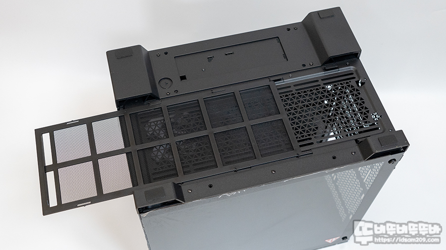 바닥면에는 플라스틱 가이드가 사용된 먼지 필터의 경우 케이스 앞쪽으로 당겨서 탈부착하는 구조로 되어있으며 바닥면에 쿨링팬 또는 라디에이터 장착 시 먼지 필터를 분리하고 나사 채결을 해야 합니다.
