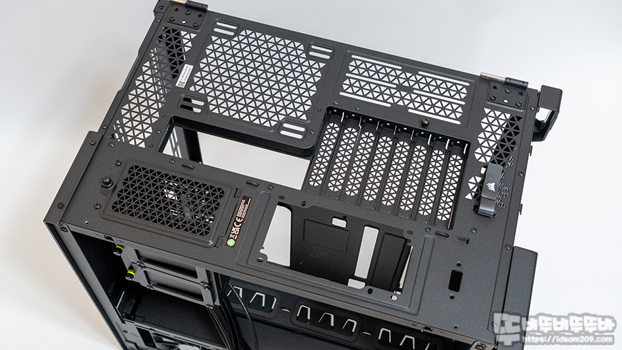 PCI 슬롯이 8개로 구성된 미들 케이스인 iCUE LINK 6500X RGB의 메인보드 결합하는 샤시면에 타공이 많은 것을 확인할 수 있는데 현재 많이 사용하는 일반 메인보드뿐만 아니라 ASUS BTF, MSI Project Zero와 같이 일부 브랜드에서 출시한 역방향 커넥터로 구성된 M-ATX와 ATX 메인보드 제품 사용을 고려한 디자인이 적용된 것이 눈에 띄네요.