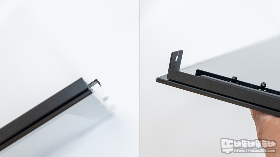 특히 힌지 부속이 부착된 뒤쪽 부분은 강화유리 앞쪽에서 스크류 나사를 이용한 뒤쪽에 철재 부속과 결합되어 튼튼함을 더해주고 있습니다.