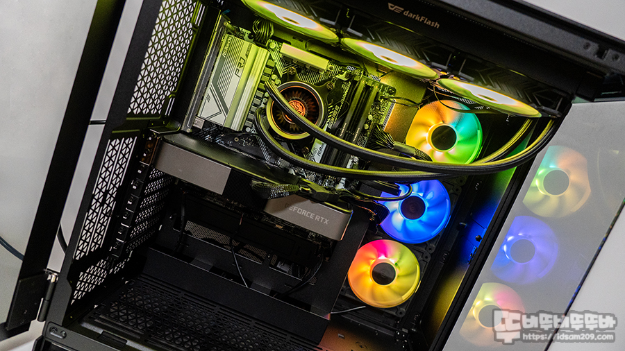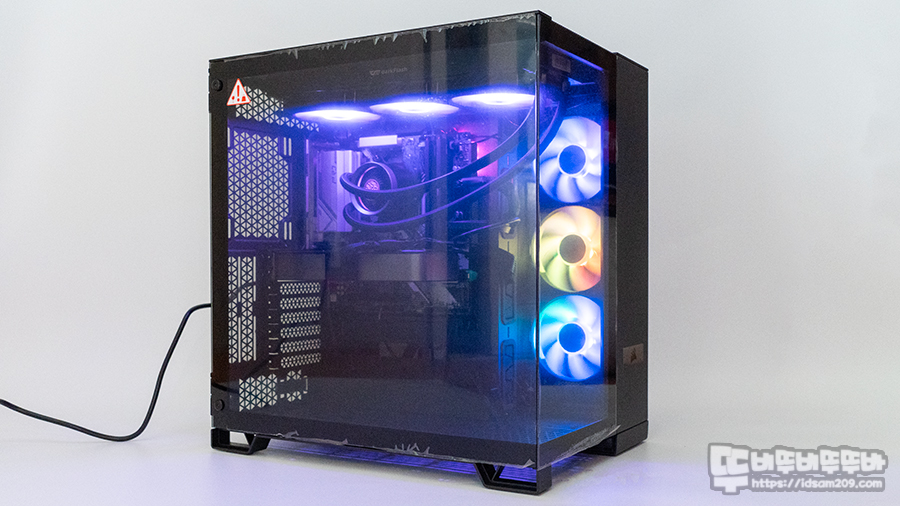 필자가 케이스 리뷰할 때 RGB 팬 컬러와 색감이 통일되는 게 중요하다고 설명드리는데 쿨링팬의 브랜드가 다르다 보니 LED 표현 방식과 색감이 살짝 언밸런스 한 느낌을 주지만 이런 느낌이라는 것만 기억해 주시기 바랍니다. ^^;