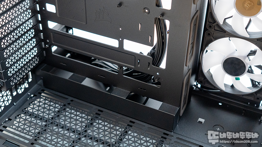 샤시 뒷면을 살펴보니 쿨링팬 관련 케이블이 보이지 않아 뭐지? 했는데 데이지 체인 방식으로 연결되는 iCUE LINK 6500X 허브를 확인할 수 있었습니다.