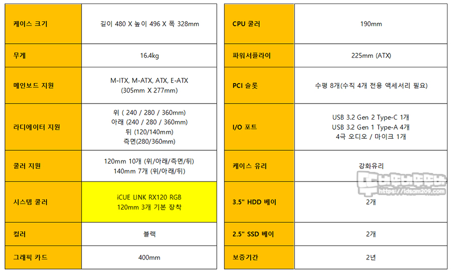 스펙 정보에서 눈에 띄는 부분이라면 16.4kg 케이스 무게, 고급 튜닝 케이스지만 쿨링팬 3개를 기본으로 지원하며 케이스 크기가 있어서 그런지 그래픽카드, CPU, 파워서플라이 장착하는 공간이 꽤 넉넉하네요.