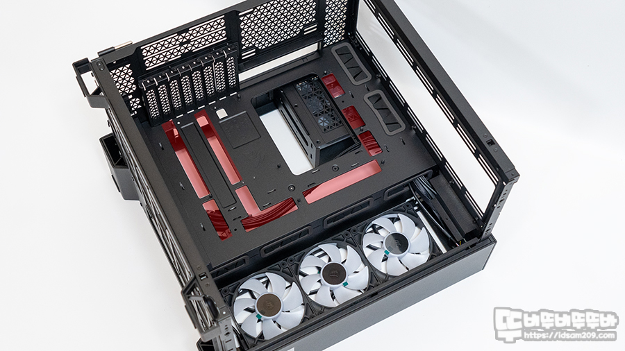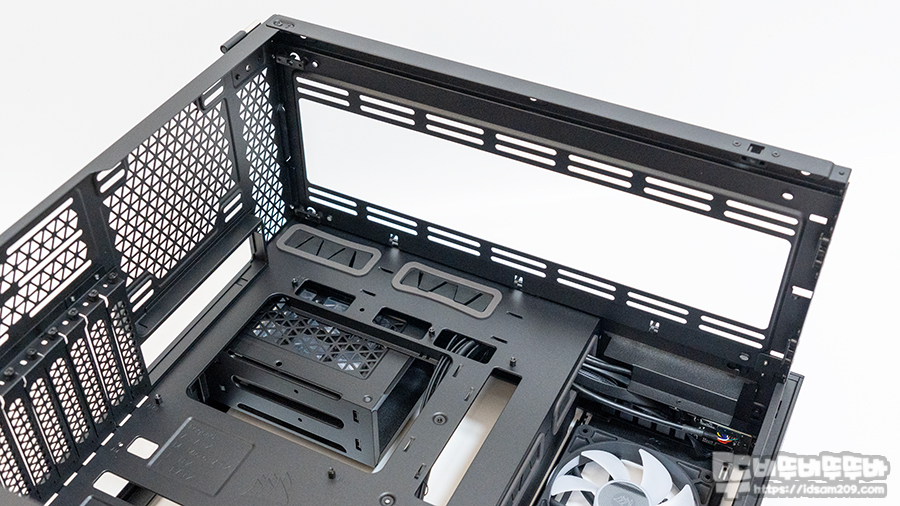여기에 메인보드 하단에 케이블이 넘어오는 부분도 돌출된 층을 만들어 케이블이 밑에서 올라오는 디자인이 적용되었는데 이 또한 샤시면을 관통하는 케이블이 보이지 않기에 깔끔한 모습을 만들어주는데 대충 만든 거 같아 보이지만 시스템을 조립하는 과정과 완성 후 모습을 보면서 꽤 많이 신경 쓴 느낌을 받았습니다.