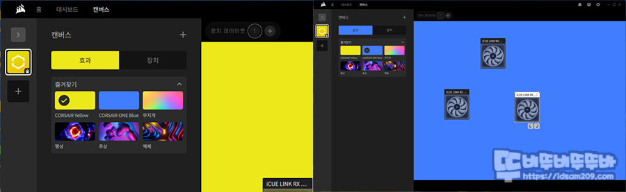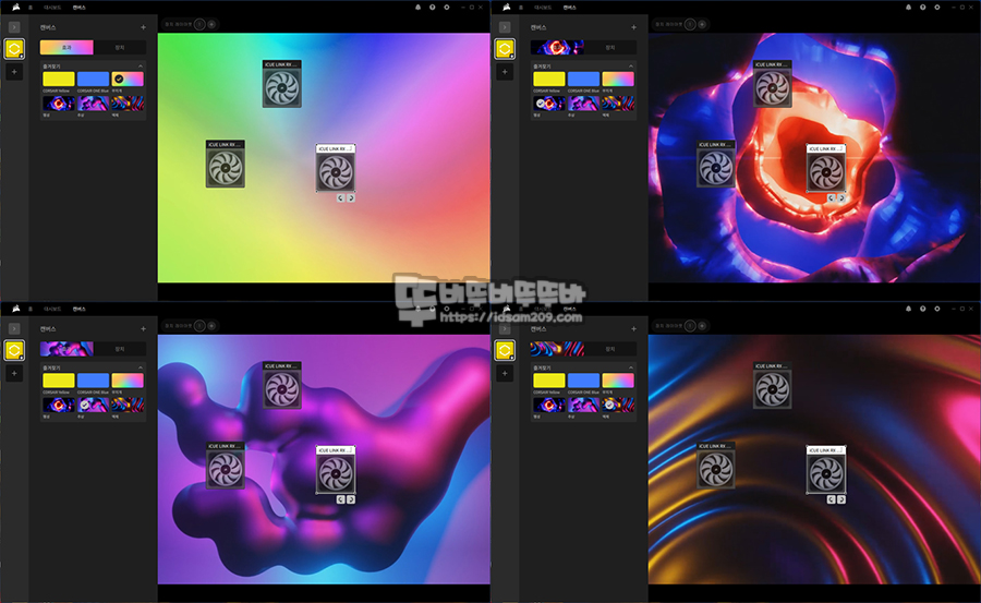캔버스의 장치 항목에서 쿨링팬을 선택하며 메인보드의 ARGB 효과와 비슷한 iCUE LINK에 정의된 RGB LED 효과를 표현해 주며 색감도 진하게 표현되기에 만족스럽게 사용할 수 있으니 2가지 효과를 취향에 맞게 사용하시면 좋을 거 같네요.