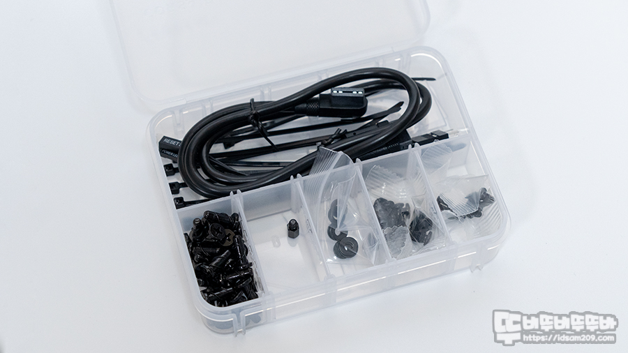 깔끔하게 구성된 툴 박스에는 테이지 체인 방식의 iCUE LINK 쿨러를 연결하는 연결 케이블 F_PANNEL 연장 케이블, 약간의 케이블 타이 그리고 쿨링팬 결합 나사, 메인보드, HDD 등 결합 나사와 와셔, 메인보드를 지지하는 육각 스탠드오프로 구성되어 있으며 칸막이로 구성된 툴 박스에 나사가 들어있어 분실되지 않게 사용할 수 있어 좋았네요.