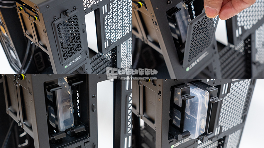 후면의 HDD 가이드 부분은 손나사를 풀고 커버를 분리하면 HDD 가이드 손잡이를 눌러서 트레이를 꺼내면 HDD 장착이 가능하며 조립 전에는 앞에 들어있는 툴 박스를 꺼내는 주시기 바랍니다.