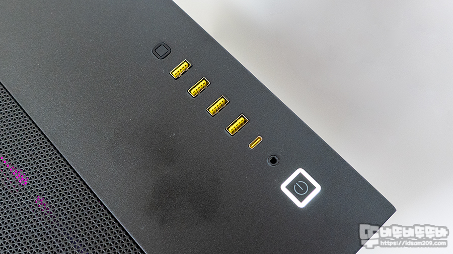 케이스 상단의 측면에 위치한 I/O 패널은 화이트 LED가 점등되는 전원 버튼, 4극 단자가 사용된 오디오/마이크 소켓, USB-C, USB-A 단자 그리고 리셋 버튼으로 구성되어 있고요.
