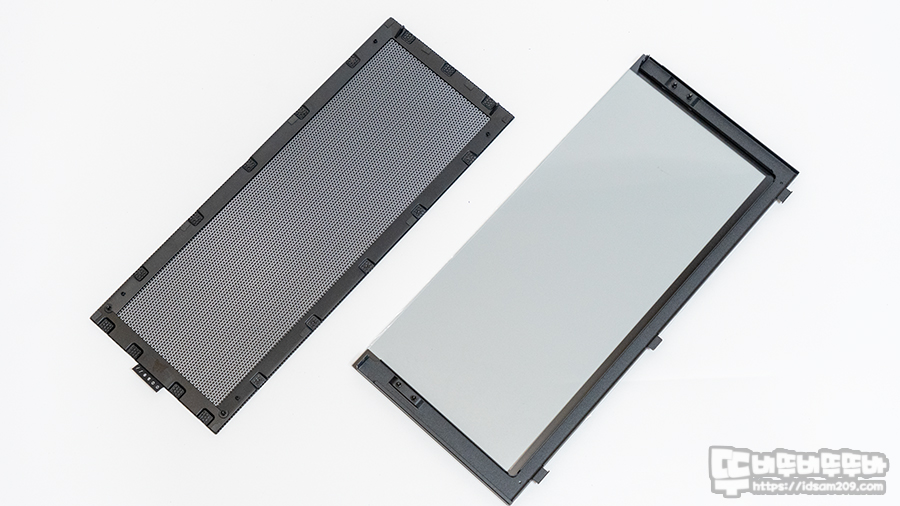 왼쪽은 케이스 상단의 타공 패널과 오른쪽은 전면 강화유리 패널입니다.