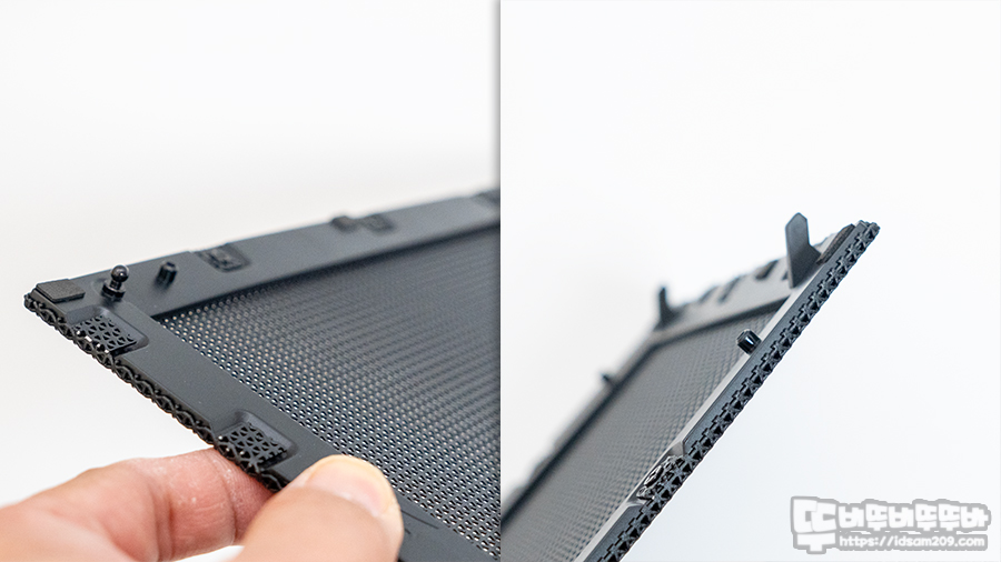 상단에 탈부착이 가능한 메쉬 필터는 앞쪽에 걸어주는 돌기가 있고 그 외에는 볼 헤드 타입의 돌기가 있어서 앞쪽에 돌기로 위치를 잡아주고 볼 헤드를 이용하여 샤시의 내부의 소켓에 딸깍하고 고정하게 됩니다.