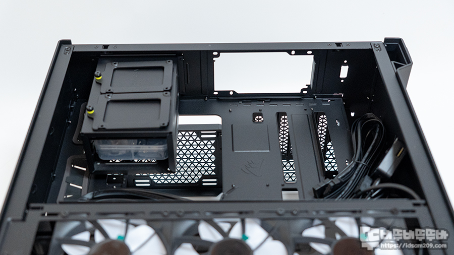 여기에 메인보드 하단에 케이블이 넘어오는 부분도 돌출된 층을 만들어 케이블이 밑에서 올라오는 디자인이 적용되었는데 이 또한 샤시면을 관통하는 케이블이 보이지 않기에 깔끔한 모습을 만들어주는데 대충 만든 거 같아 보이지만 시스템을 조립하는 과정과 완성 후 모습을 보면서 꽤 많이 신경 쓴 느낌을 받았습니다.