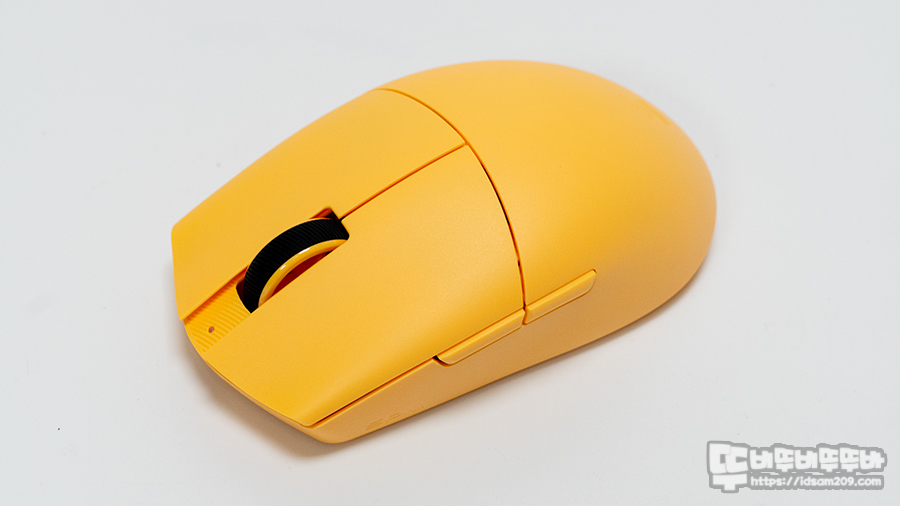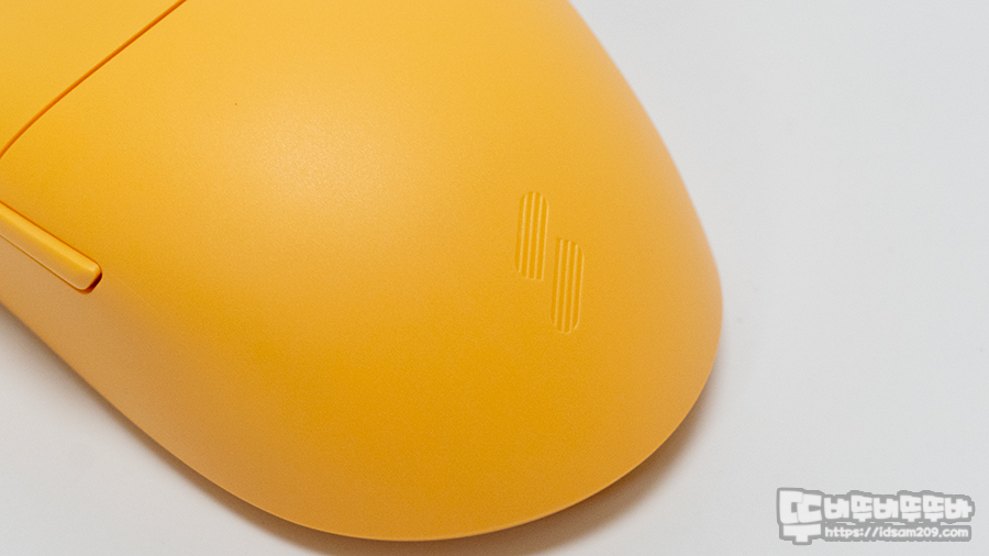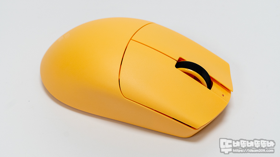 대칭형 디자인 오른손 전용으로 출시한 제품이기에 마우스 왼쪽 부분에 사이드 버튼이 위치하고 있으며 짧은 길이에 비해 좌우폭이 63.3mm 꽤 넓은 편에 속하기에 마우스 그립 시 꽉 찬 느낌으로 안정감을 줍니다.