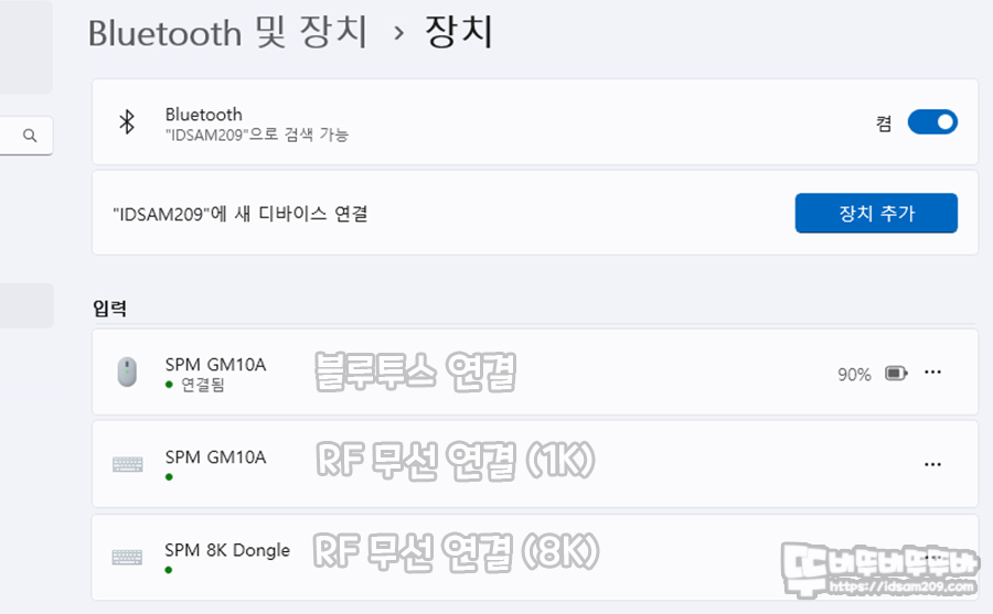 특히 무선 동글을 이용한 1K, 8K 연결은 기기 명칭에서 구분이 되며 블루투스 연결의 경우 배터리 아이콘과 퍼센트 정보를 제공하는데 블루투스 연결 시 전용 프로그램 지원이 안되니 참고하시기 바랍니다.