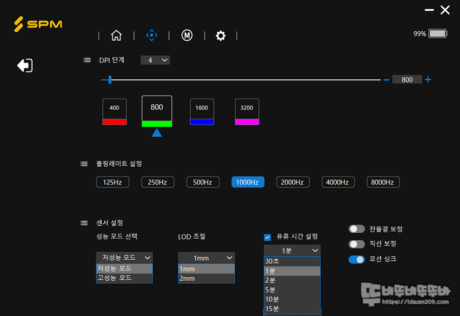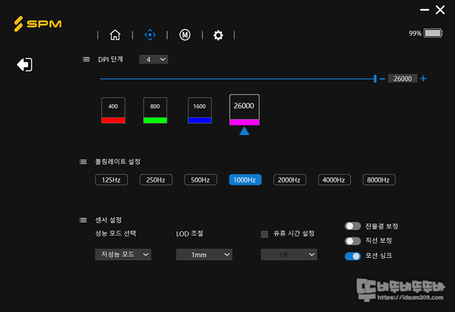 50 단위로 조절이 가능한 DPI 메뉴에서는 4단계 DPI 값 지원, 최대 2600 DPI, 8K 동글 사용 시 1000/2000/4000/8000Hz 선택이 폭이 넓어지며 2000Hz 이상부터는 성능 모드 선택 메뉴가 "고성능 모드"로 고정됩니다.