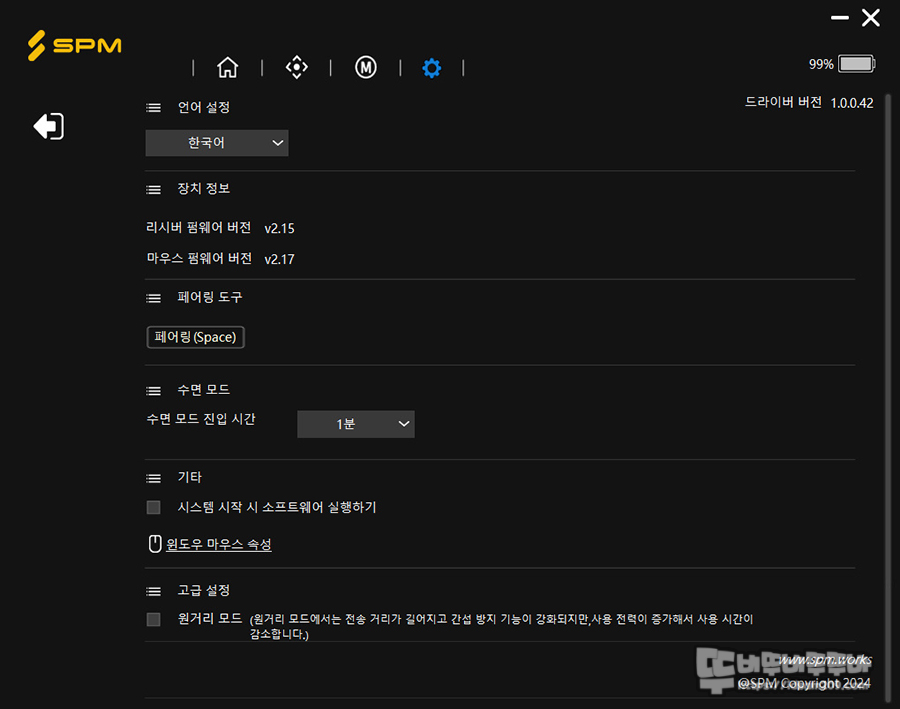 SPM GM10A 게이밍 마우스의 소프트웨어는 람주 브랜드의 소프트웨어 동일한데 일종에 레퍼런스 소프트웨어에 스킨을 변경한 느낌입니다.