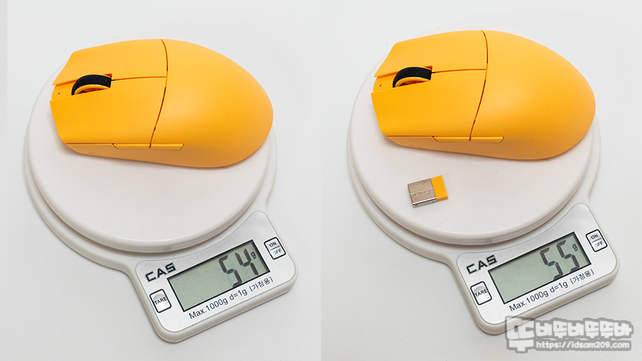 1g 단위로 측정 가능한 디지털 저울로 무게 측정 시 무선 리시버를 내장하지 않는 경우 54g 무선 리시버를 포함하면 55g으로 측정됩니다.