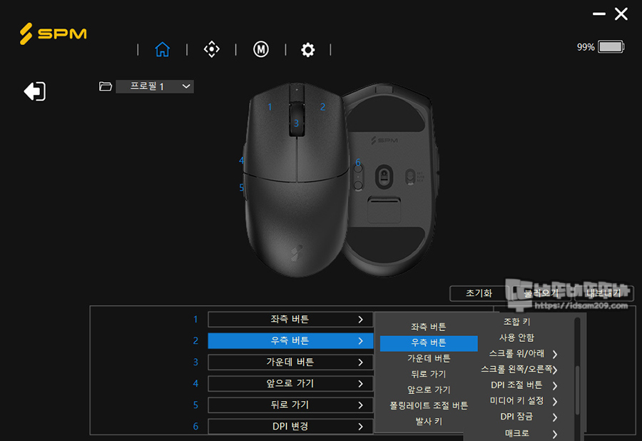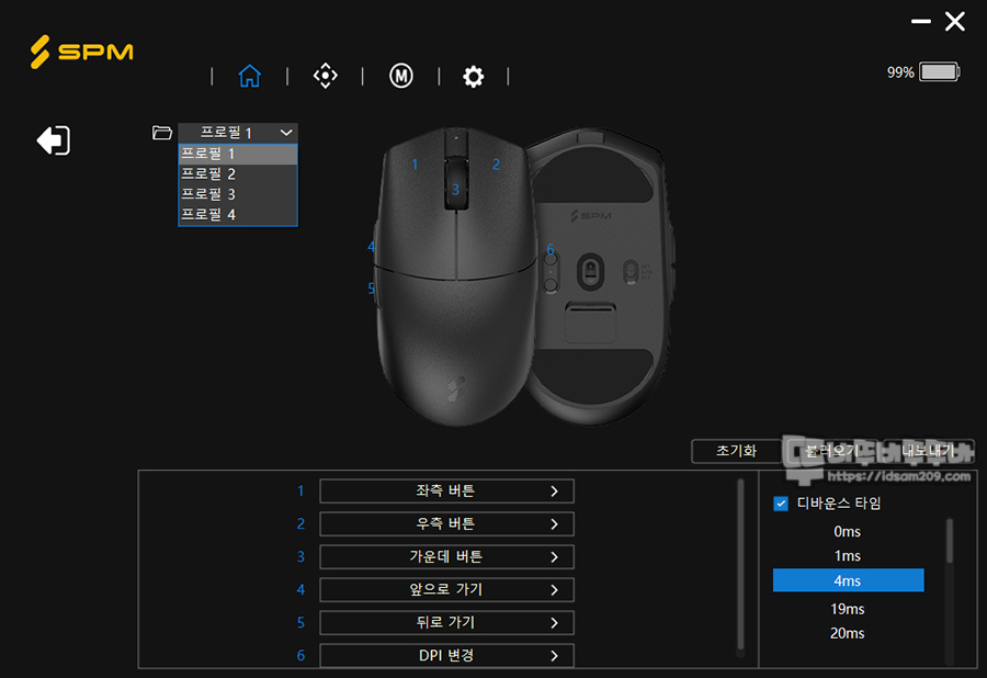 가장 먼저 보이는 버튼 메뉴에서는 4개의 프로파일 지원, 디바운스 타임(0ms~20ms) 선택이 가능하며