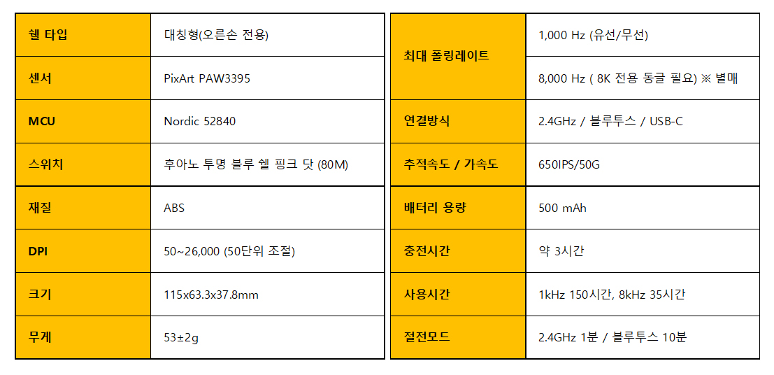 최근까지는 1kHz를 지원하는 마우스의 사용시간이 100시간을 넘기지 못했는데 500mAh 배터리 용량, Nordic 52840 MCU 사용으로 무선 8K 지원 가능, 150시간(1kHz), 35시간(8kHz) 등의 스펙을 보면 확실히 상향 평준화가 되었다는 점을 절실하게 느낄 수 있었는데요.