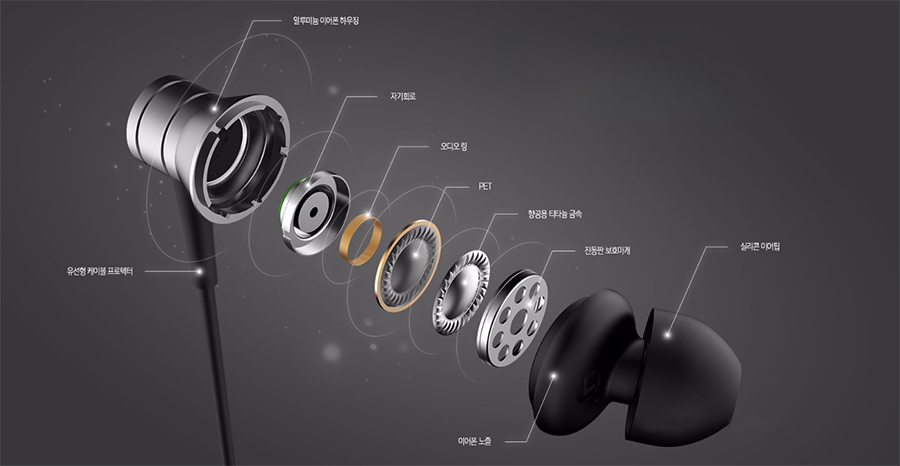 양극산화(아노다이징) 처리된 알루미늄 합금 바디는 심플하면서 깔끔한 느낌을 주며 하우징 끝부분의 노즐 부는 플라스틱 소재를 사용하여 귀에 닿았을 때 금속의 차가움이 느껴지지 않습니다.