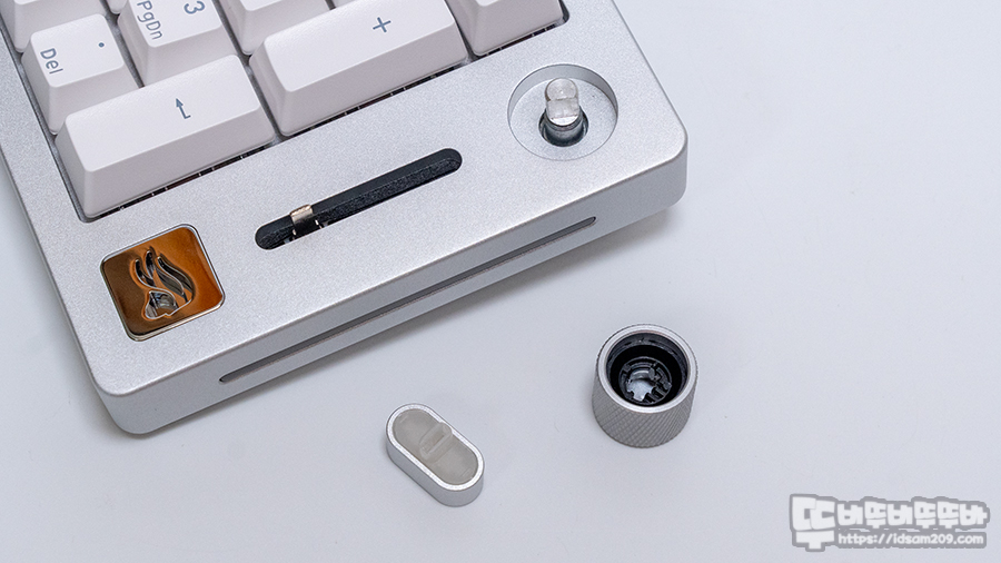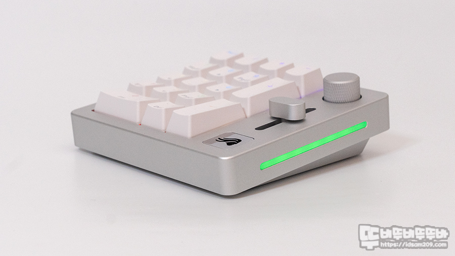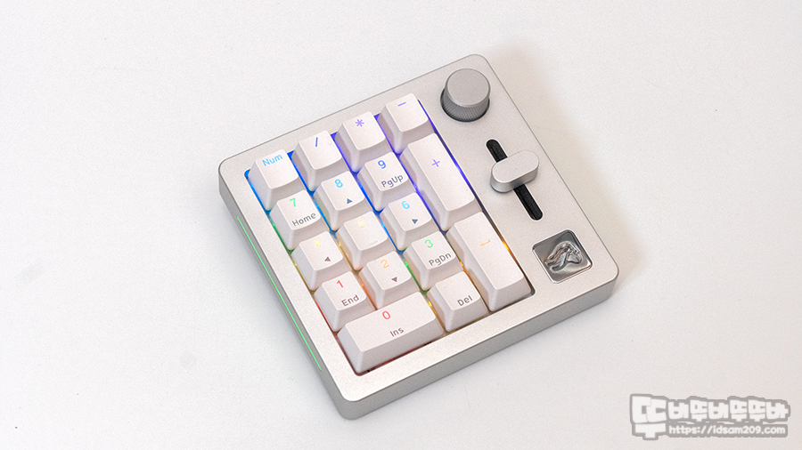 상하판 결합 방식의 풀 CNC 알루미늄 소재가 사용된 글로리어스 GMMK NUMPAD 유무선 커스텀 키패드는 기본적인 키패드 우측에 노브와 슬라이드 기능이 추가되어 뭔가 있어 보이는 디자인이 특징입니다.