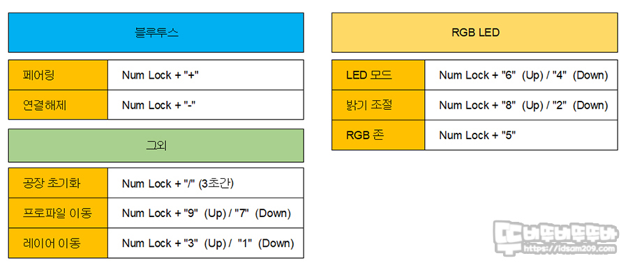 블루투스 페어링, 연결 해제, LED 모드, 밝기 조절, LED 존 선택, 프로파일 및 레이어 선택, 공장 초기화 그리고 도표에 이외에 QMK 사용을 위한 부트로드 키도 지원하고요.