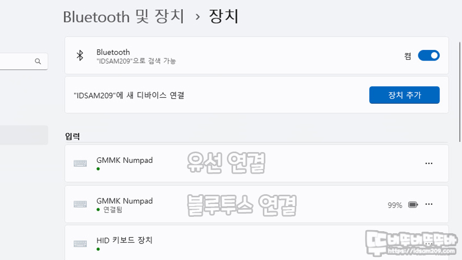 유선 연결과 무선 연결 시 기기 명칭이 동일하게 표시되지만 블루투스의 경우 배터리 잔량을 표현하는 아이콘이 추가로 표현되기에 구분이 가능네요.