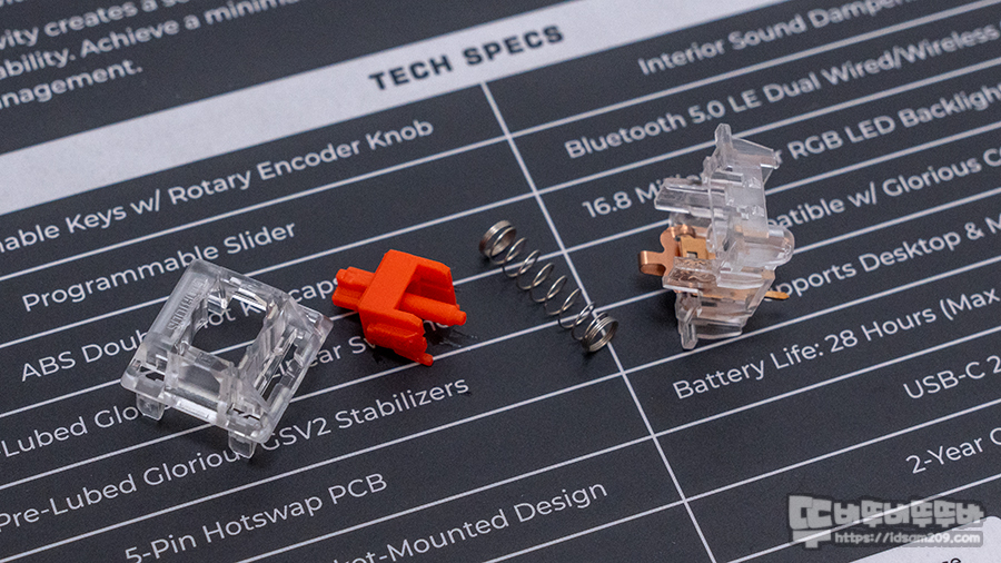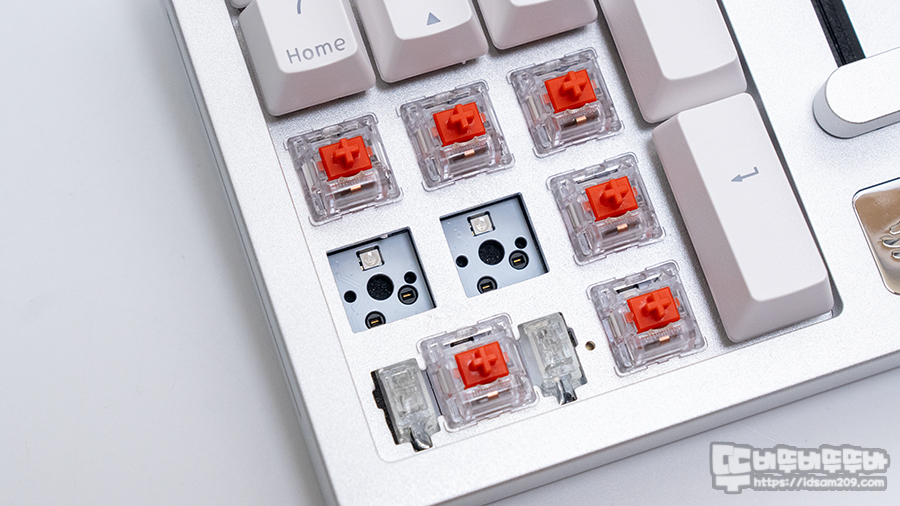 5핀 스위치가 사용 가능한 핫스왑 기판과 기보강 흡음재 및 기판과 하우징 하판의 흡음재 사용과 보강판과 하우징 상판 내부의 스펀지 가스켓 구조로 GMMK Pro와 비슷한 안정감 있는 타이핑 느낌을 주네요.